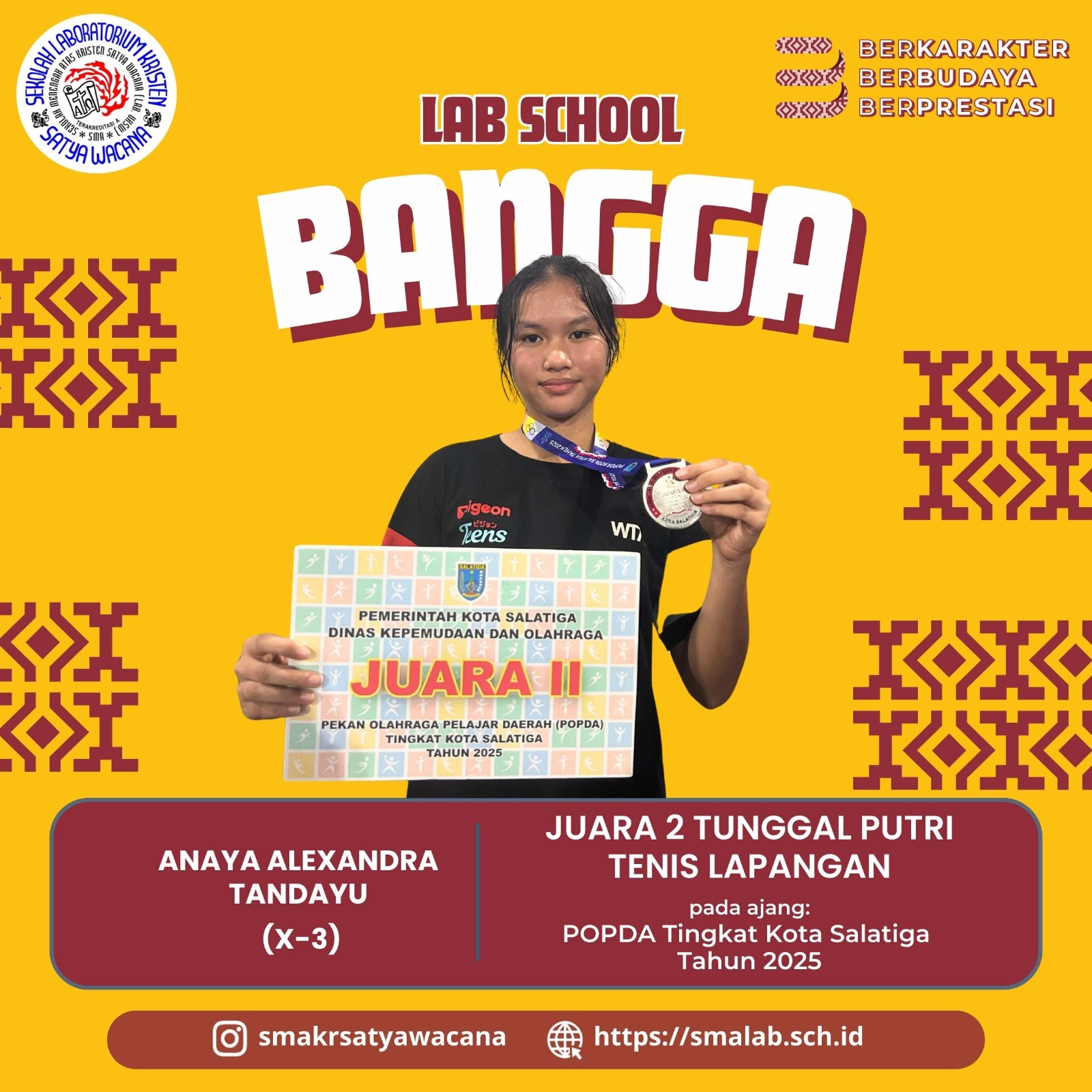 Anaya Alexandra Tandayu X-3 berhasil meraih Juara III Tunggal Tensi Lapangan POPDA Salatiga 2025. Anaya membuktikan bahwa dirinya mampu berjuang di babak final hingga meraih predikat yang sekarang ia pegang.